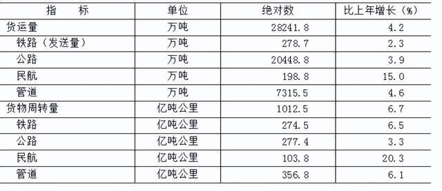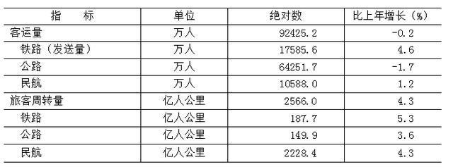 全年货运量28241.8万吨,比上年增长4.2%;货物周转量1012.5亿吨公里,增长6.7%。全年客运量[9]92425.2万人,下降0.2%;旅客周转量2566.0亿人公里,增长4.3%。