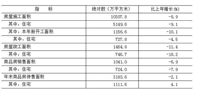 全年房地产开发投资比上年下降15.5%。全市房屋施工面积10307.8万平方米,比上年下降8.9%。其中,本年新开工面积1156.6万平方米,下降10.1%。全年房屋竣工面积1464.8万平方米,下降11.4%。全年新建商品房销售面积1041.0万平方米,下降6.9%。二手房交易网签面积[12]1682.7万平方米,增长0.9%。